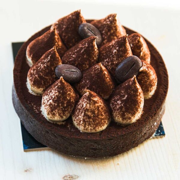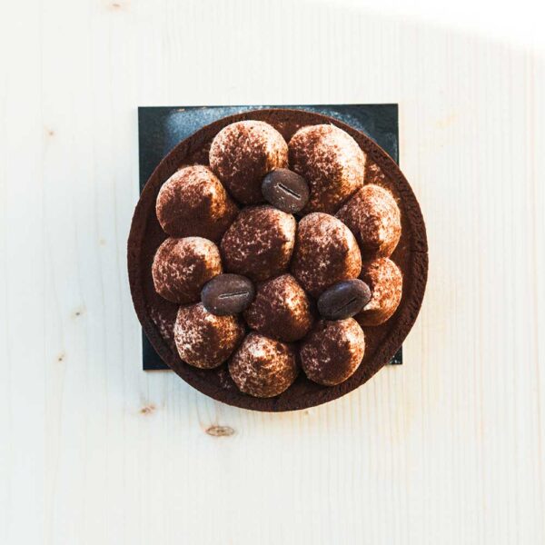 Crema mascarpone aromatizzata al marsala, su un morbido pan di spagna aromatizzato al caffé e frolla al cacao.